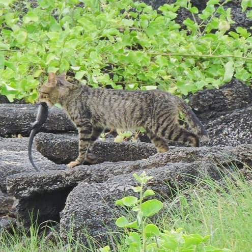 When people came to the Galápagos, they brought other species along, including cats, rats, and dogs. These animals are now living wild (feral) on several islands Since these predators are so new to the islands, the local wildlife lack natural defences. It is known that Marine Iguanas—especially the smallest and youngest—are hunted by these invasive species, and some populations are thought to be very heavily affected. In such populations, we see very few young iguanas. Without enough young iguanas, the future is very uncertain, and there is concern that this could lead to extinction of whole subspecies, such as the Godzilla iguana from San Cristobal island.